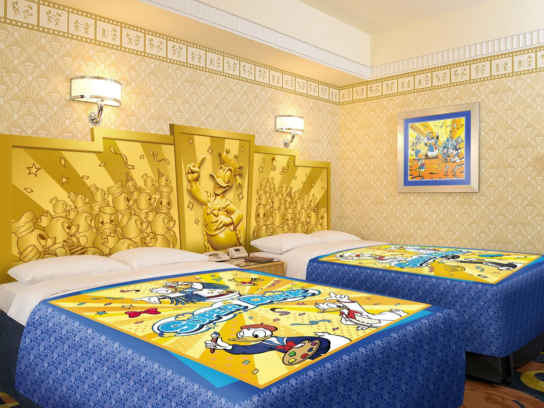 ドナルドがたくさんのクワッキーダックに囲まれているデザインのヘッドボードや、ミッキーマウスと仲間たちがドナルドを褒め称えている壁掛けアートが飾られ、ダックシティのにぎやかでユニークな世界が広がるお部屋です。
